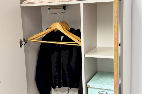 С другой - три больших полки, идеально подходящие для хранения одежды, книг или декоративных предметов.