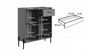 С другой стороны комод оборудован выкатным ящиком, который обеспечивает легкий доступ к часто используемым предметам. Под ним расположен большой глухой фасад, скрывающий за собой просторное хранилище для более крупных вещей.